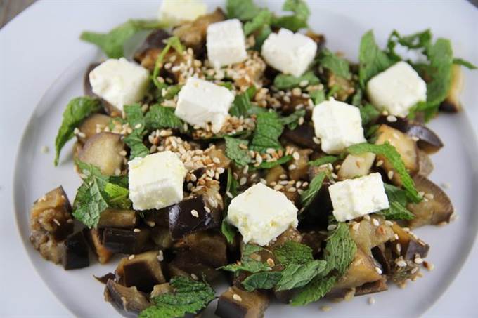Баклажаны режем кубиками. Перекладываем их в миску с соусом. Присыпаем мятой и кунжутом, перемешиваем и даем настояться минут 10.