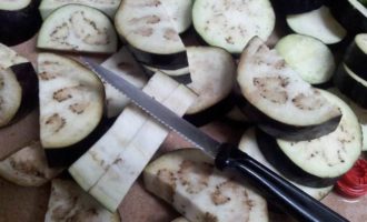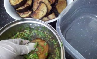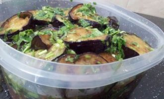 Окунаем каждую половинку баклажана, чтобы кинза окутала баклажан равномерно. Почему каждую половинку отдельно и не перемешиваем сразу? Потому что жареный баклажан мягкий, и если перемешать, то может все развалиться и потеряется вид. Складываем в пустую емкость. Далее оставшийся маринад выливаем сверху.