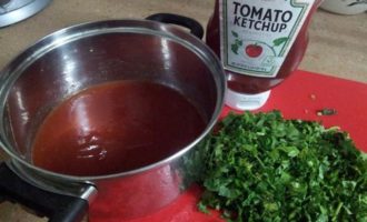 В кастрюльке делаем маринад: кетчуп, вода, уксус, чеснок (выдавить), кинза(мелко порезать), сахар, соль.