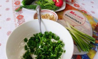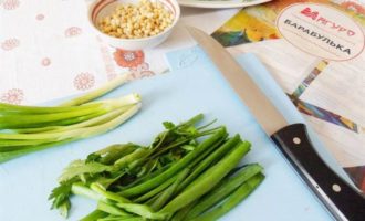 • Часть перьев зеленого лука и несколько веточек петрушки мелко нарезать.