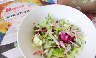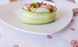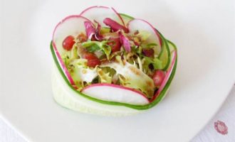 • Пока барабулька запекается, можно подготовить легкий овощной салат. Я приготовила салатный микс с редисом и огурцом. Заправка — смесь гранатового соуса с оливковым маслом.