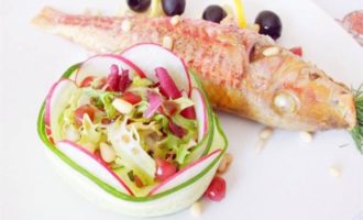 • Сервируем блюдо. Горячая барабулька, легкий овощной салат, кружки лимона, оливки, зерна граната и кедровые орешки.
