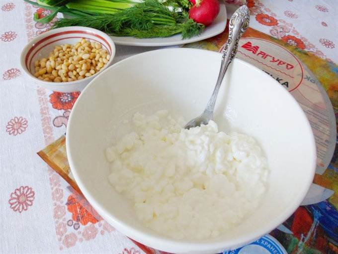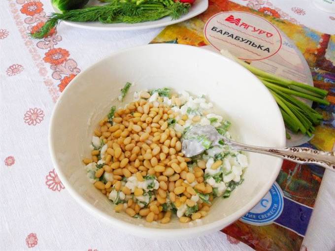 • Кедровые орешки тоже отправить в миску. Влить столовую ложку оливкового масла.