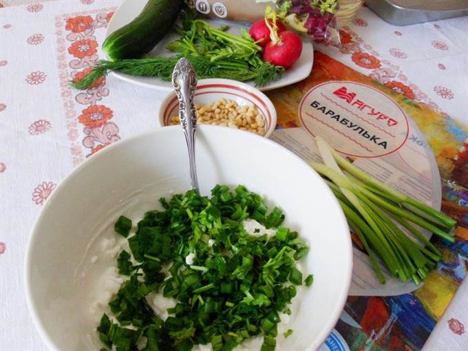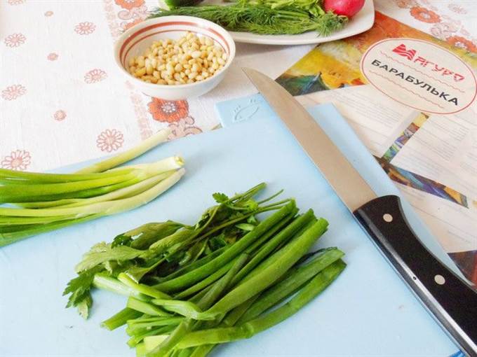 • Часть перьев зеленого лука и несколько веточек петрушки мелко нарезать.