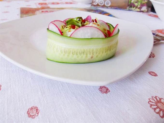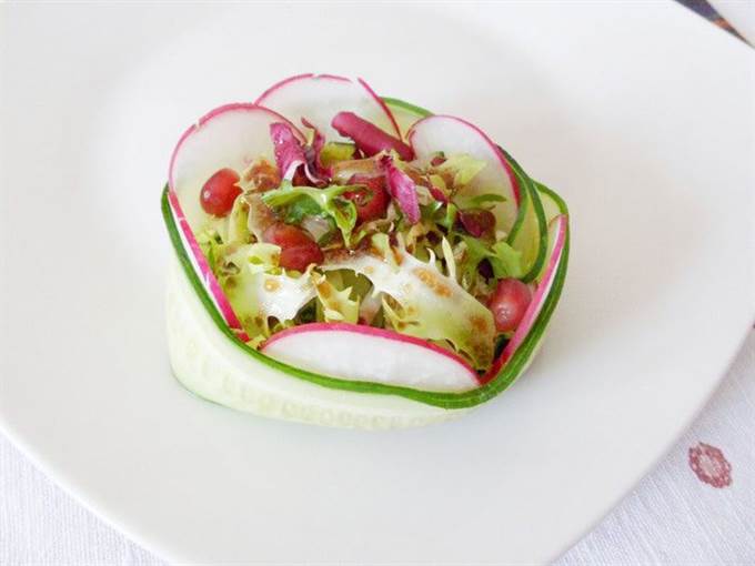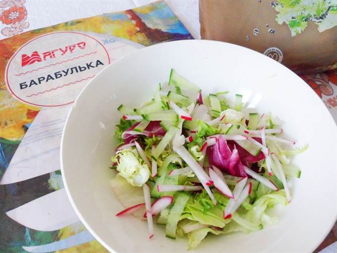 • Пока барабулька запекается, можно подготовить легкий овощной салат. Я приготовила салатный микс с редисом и огурцом. Заправка — смесь гранатового соуса с оливковым маслом.
