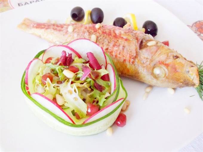 • Сервируем блюдо. Горячая барабулька, легкий овощной салат, кружки лимона, оливки, зерна граната и кедровые орешки.