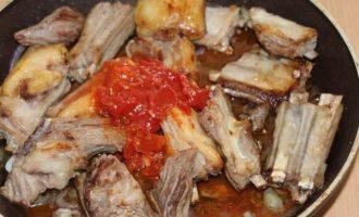 Добавляем помидоры в собственном соку и томатную пасту «Помидорка», измельченные в ступке семена кориандра и тмина, паприку.