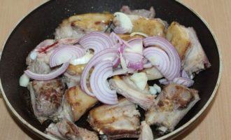 Добавить нарезанные лук и чеснок, потушить вместе с мясом до мягкости лука, посолить, поперчить.