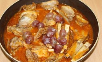 Добавить кипяток, попробовать на соль, потушить минут 30. Затем добавить виноград и тушить еще около 30 минут.