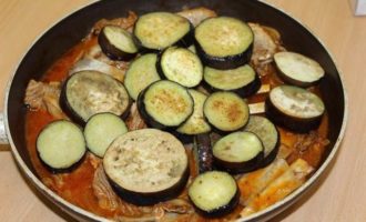 Когда мясо станет мягким, добавить баклажаны, предварительно обжаренные в другой сковороде. Аккуратно все перемешать, чтобы кружочки баклажан остались целыми. Потомить на медленном огне 5 минут. Выключить плиту, дать настояться 5 минут. На гарнир можно подать рис.