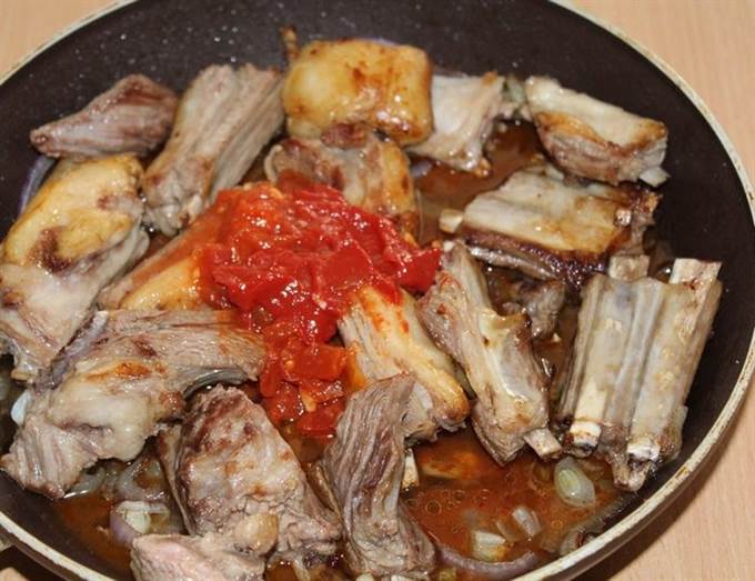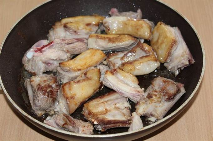 Баранину обжарить на раскаленном масле до золотистой корочки.