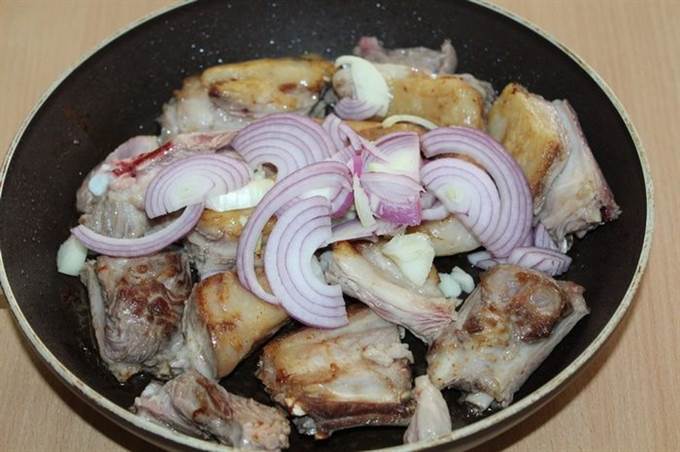 Добавить нарезанные лук и чеснок, потушить вместе с мясом до мягкости лука, посолить, поперчить.