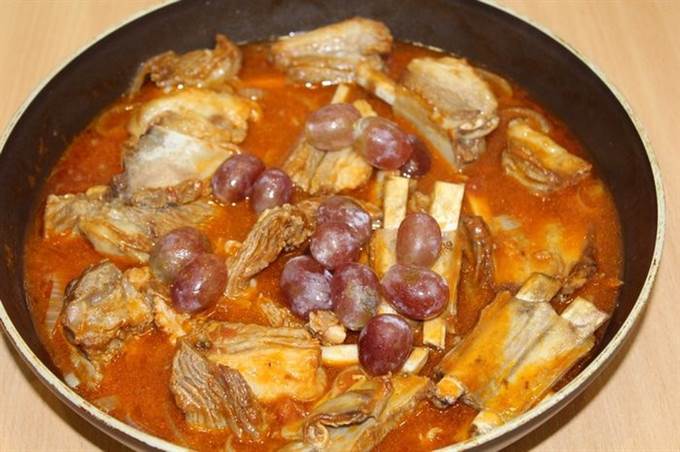 Добавить кипяток, попробовать на соль, потушить минут 30. Затем добавить виноград и тушить еще около 30 минут.