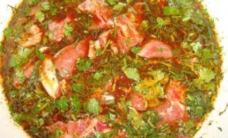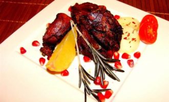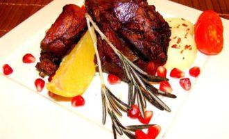 В оливковое масло добавить порезанный чеснок, смесь перцев, листочки с одной веточки розмарина. Выложить куски баранины, перемешать. В гранатовый сок добавить порезанные укроп и кинзу, специи, соль. Залить мясо и оставить минимум на 3 часа.