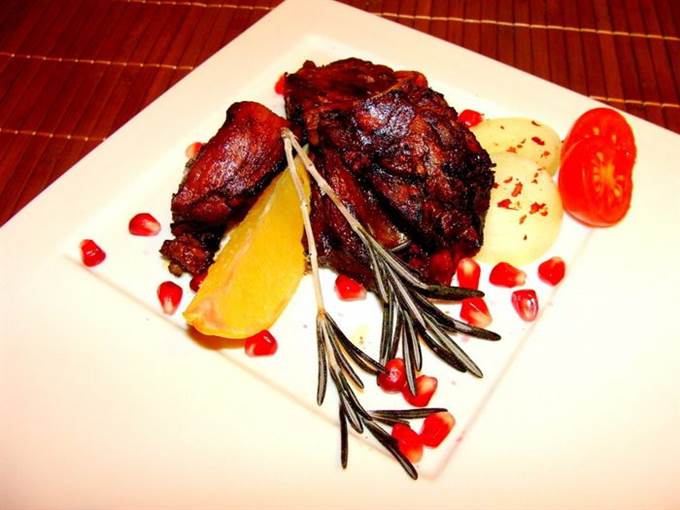 В оливковое масло добавить порезанный чеснок, смесь перцев, листочки с одной веточки розмарина. Выложить куски баранины, перемешать. В гранатовый сок добавить порезанные укроп и кинзу, специи, соль. Залить мясо и оставить минимум на 3 часа.
