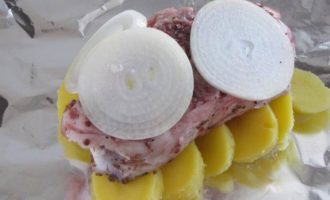 На квадратный лист фольги размером примерно 35х35 см. выложить картофель. Посолить. Накрыть его куском мяса со специями. Поверх мяса выложить лук, нарезанный кольцами, и вновь посолить. Масло добавлять не нужно, т.к. баранина достаточно жирное мясо, оно будет томиться в собственном соку.