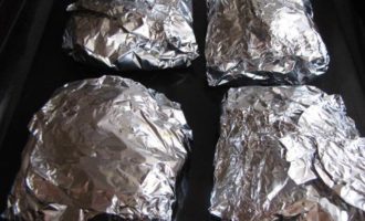 Завернуть фольгу, свернув и обжав поднятые края сверху. Положить конверты на противень и поставить в разогретую до 180 град. духовку. Запекать 1 час.