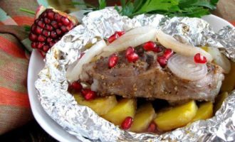 При подаче рядом с куском мяса выложите картофель вместе с луком. Мясо полить соусом со дна фольги. Или можно подать прямо в фольге. Украсить зеленью и зернами граната.
