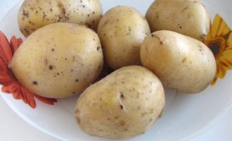Пока мясо маринуется, отварить картофель в мундире. Остудить, почистить и нарезать кружочками.