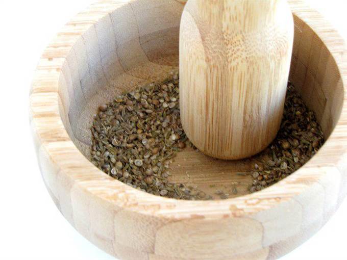 Зиру, кориандр, перец горошком растереть в ступке не слишком мелко.