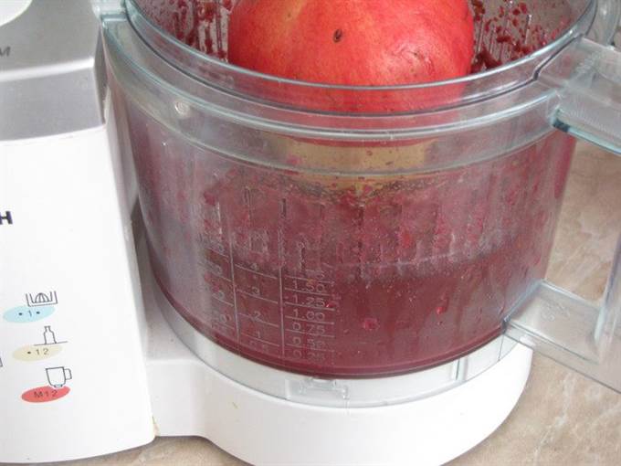 Отжать сок из граната. Это можно сделать разными способами. Я выбрала самый простой — прокрутила половинку граната на соковыжималке для цитрусовых. Сока одного граната мне хватило, чтобы замариновать 4 порции мяса.