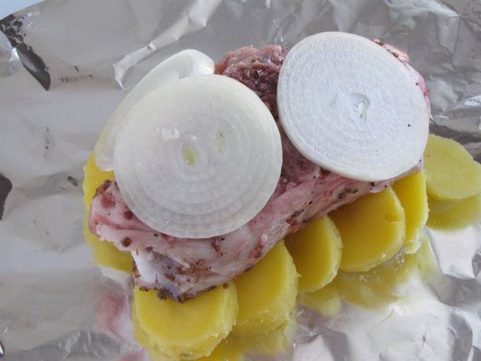 На квадратный лист фольги размером примерно 35х35 см. выложить картофель. Посолить. Накрыть его куском мяса со специями. Поверх мяса выложить лук, нарезанный кольцами, и вновь посолить. Масло добавлять не нужно, т.к. баранина достаточно жирное мясо, оно будет томиться в собственном соку.