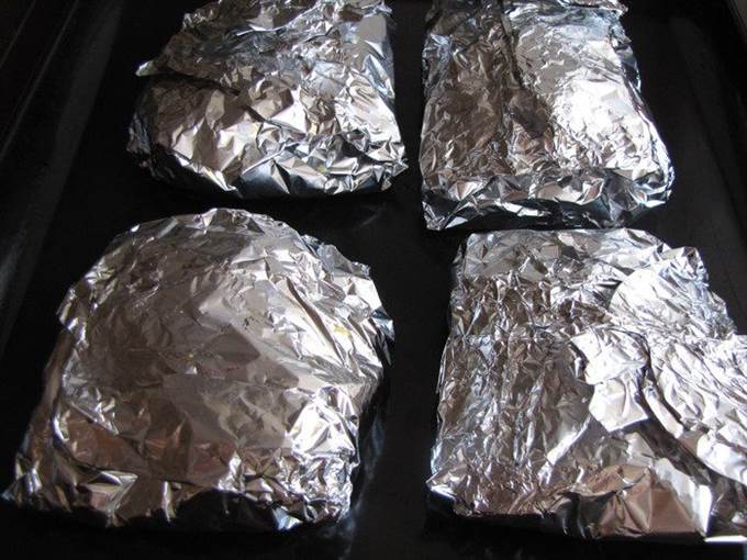 Завернуть фольгу, свернув и обжав поднятые края сверху. Положить конверты на противень и поставить в разогретую до 180 град. духовку. Запекать 1 час.