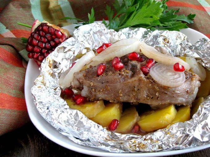 При подаче рядом с куском мяса выложите картофель вместе с луком. Мясо полить соусом со дна фольги. Или можно подать прямо в фольге. Украсить зеленью и зернами граната.