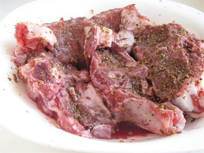 Натереть получившемся соком куски баранины. Присыпать сверху специями и оставить в холодильнике на 2 часа.