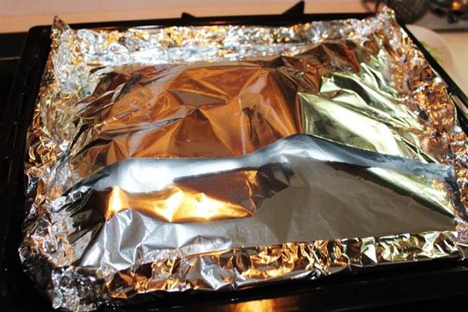 • Прикрыть сверху фольгой, защипить со всех сторон края и поставить в разогретый духовой шкаф… сначала на 1,5 часа.