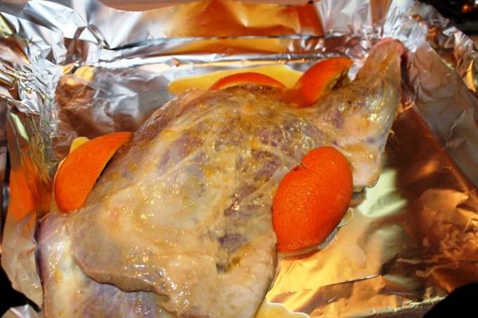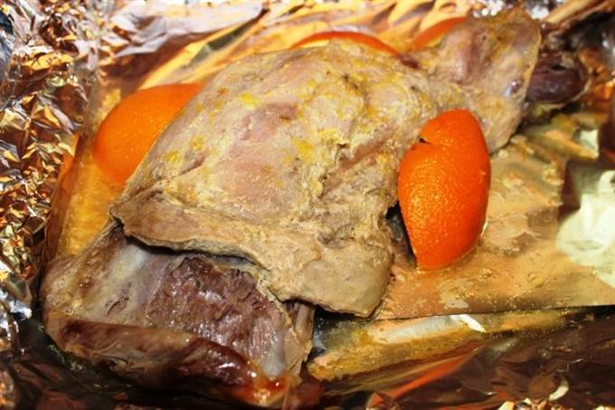 • Духовой шкаф нагреть до 200 градусов. На противень застелить фольгу в два слоя, выложить на нее баранью ногу, залить соком апельсина (соком второй его половинки) и обложить апельсиновой кожурой.