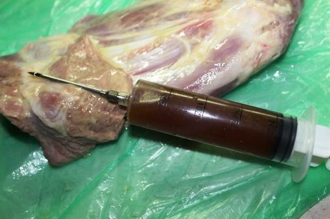 • Для маринада смешать сок половины апельсина, соевый соус и 1 ложку меда, разбавленного горячей водой. Наполнить этим маринадом специальный кулинарный шприц для мяса и наколоть баранью ногу со всех сторон. Следует помнить, что при накачивании ноги маринадом необходимо немного массировать мышцы, чтобы он не выливался обратно из проделанного иглой отверстия.