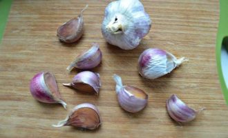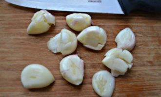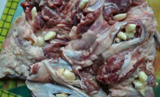 • Сделайте в ноге несколько неглубоких надрезов и вставьте в них чеснок (2 зубчика оставить для топинадо). Немного сверху подсолить.
