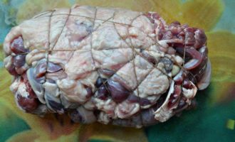 • Теперь мы будем ногу связывать, складывая мясо таким образом, чтобы получился мясной рулет. Затем свяжите его с помощью кулинарной нити.