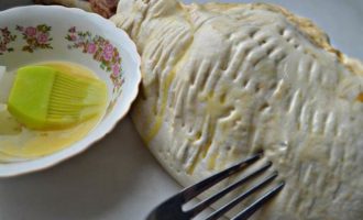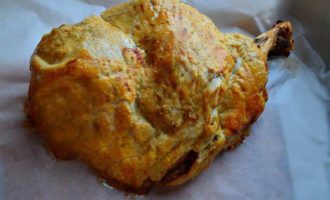 • Затем укутать ногу тестом и уложить на противень, выстеленный пергаментом. С помощью вилки сделать наколы по всей поверхности.