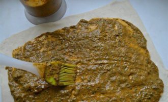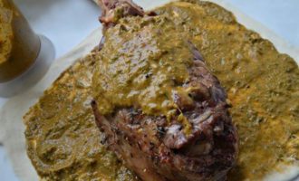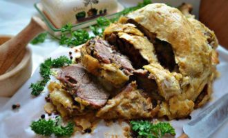 • Уложить сверху баранью ногу вместе с оставленной частью кости. И также хорошо обмазать топенадой.