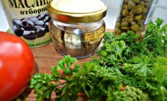 Для этого порубить петрушку, подготовить маслины, каперсы, 2 зубчика чеснока, анчоусы, оливковое масло (1 ст л) и помидор.