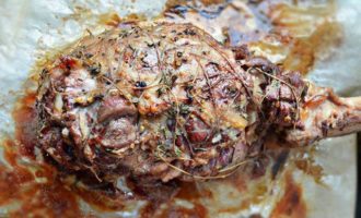 • Вынуть доведённую до полуготовности ногу из духовки и обязательно остудить до комнатной температуры. Аккуратно снять кулинарную нить