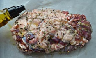 • Сформированную ногу-рулет посолить и поперчить со всех сторон, смазать оливковым маслом и слегка промассировать мясо, чтобы все ароматы соединились. Сверху уложить веточки тимьяна. Дополнительно я сбрызнула оливковым маслом с ароматом чёрного трюфеля, но это не обязательно. Уложить подготовленную ногу на бумагу для выпечки и поместить в разогретую до 180г духовку на 50 мин.