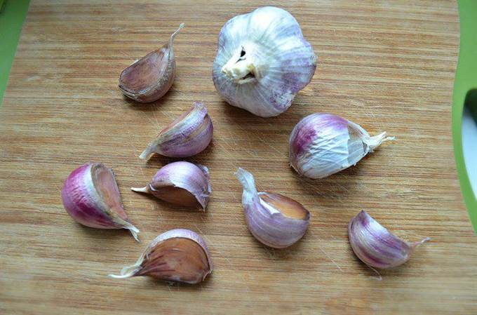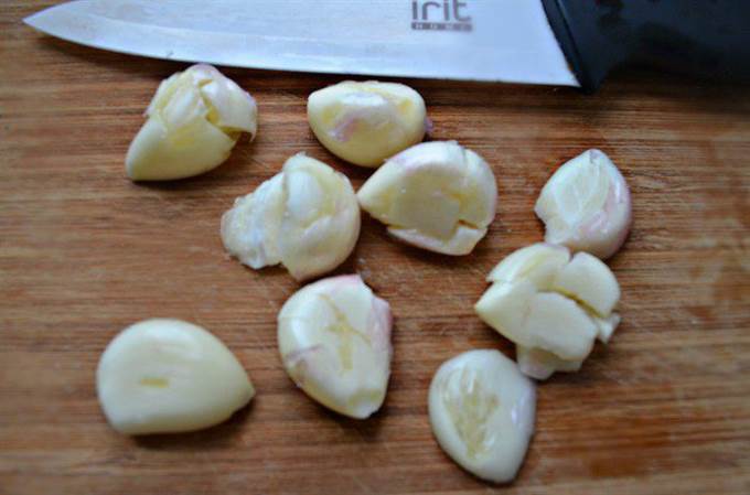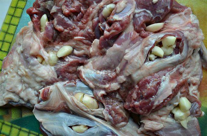 • Сделайте в ноге несколько неглубоких надрезов и вставьте в них чеснок (2 зубчика оставить для топинадо). Немного сверху подсолить.