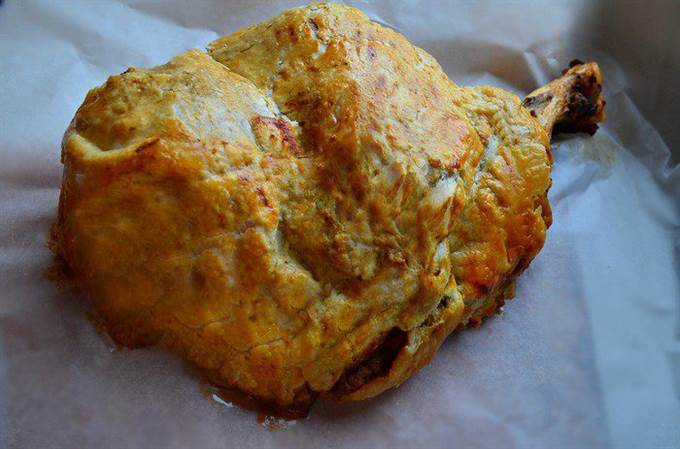 • Затем укутать ногу тестом и уложить на противень, выстеленный пергаментом. С помощью вилки сделать наколы по всей поверхности.