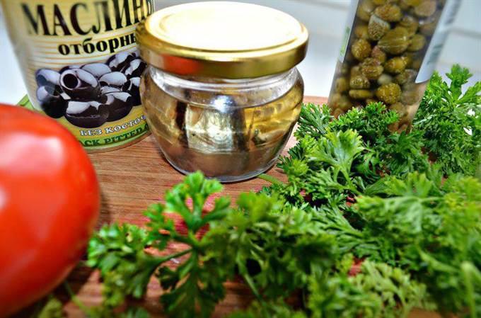Для этого порубить петрушку, подготовить маслины, каперсы, 2 зубчика чеснока, анчоусы, оливковое масло (1 ст л) и помидор.