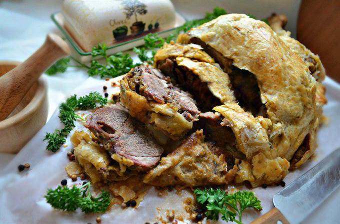 • Слоёное тесто раскатать немного больше размера бараньей ноги.