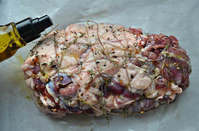 • Сформированную ногу-рулет посолить и поперчить со всех сторон, смазать оливковым маслом и слегка промассировать мясо, чтобы все ароматы соединились. Сверху уложить веточки тимьяна. Дополнительно я сбрызнула оливковым маслом с ароматом чёрного трюфеля, но это не обязательно. Уложить подготовленную ногу на бумагу для выпечки и поместить в разогретую до 180г духовку на 50 мин.