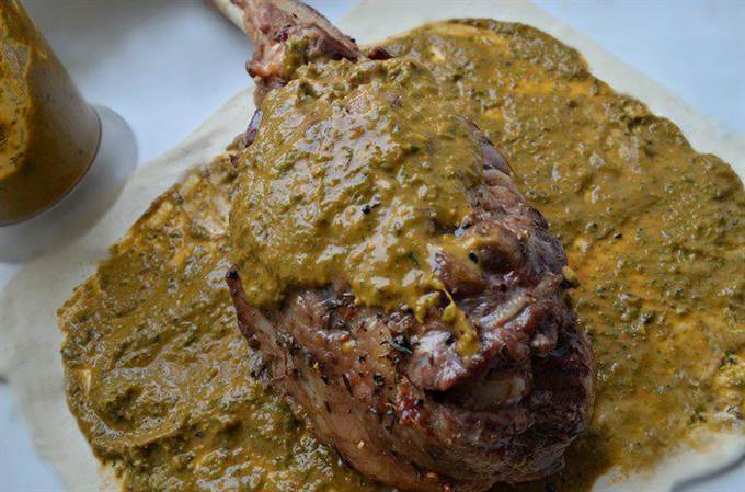 • Уложить сверху баранью ногу вместе с оставленной частью кости. И также хорошо обмазать топенадой.