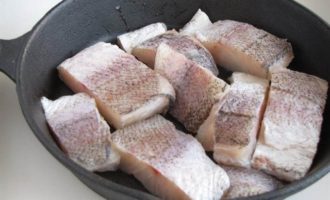 • Филе рыбы нарезать кусочками, обсушить бумажным полотенцем. Выложить в чугунную сковороду или огнеупорную форму.