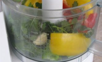 • Перец сладкий и острый очистить от семечек, нарезать произвольными кусочками, выложить в чашу блендера. Добавить очищенный лук, зубчики чеснока, базилик и кинзу. Все измельчить не слишком мелко.