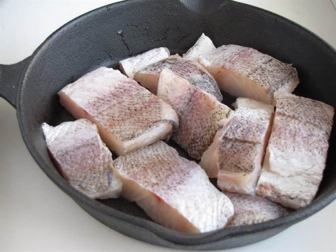 • Филе рыбы нарезать кусочками, обсушить бумажным полотенцем. Выложить в чугунную сковороду или огнеупорную форму.