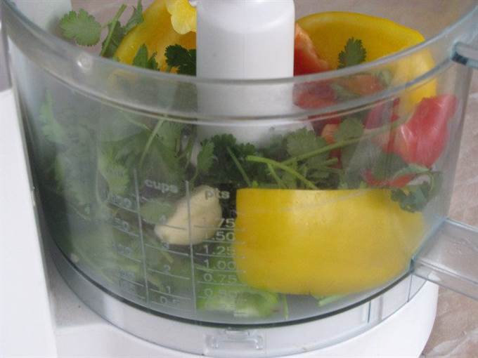 • Перец сладкий и острый очистить от семечек, нарезать произвольными кусочками, выложить в чашу блендера. Добавить очищенный лук, зубчики чеснока, базилик и кинзу. Все измельчить не слишком мелко.