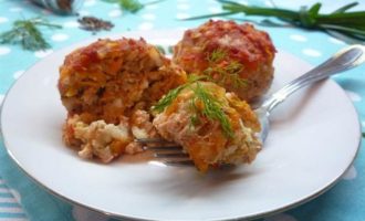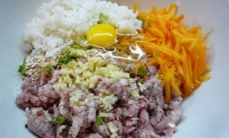 В фарш добавляем мелко рубленную зелень, отваренный до полуготовности рис, яйцо, чеснок, овсяные хлопья, натертую на крупной терке тыкву. Солим, перчим.